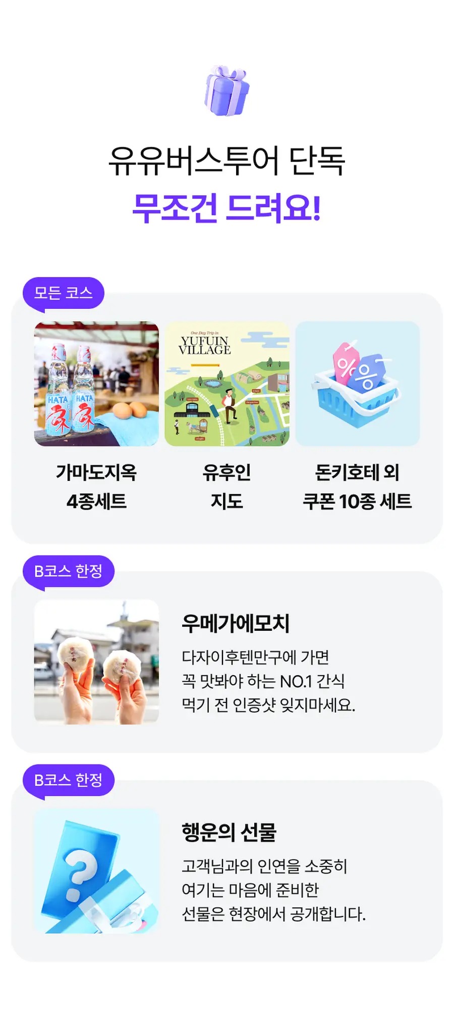 ⭐ 포함사항 ⭐ - 여행 안내원 / 차량 이용 비용 - 벳푸 가마도지옥 입장료 (1인 1장) - 벳푸 가마도지옥 온천 달걀 (1인 1개) - 벳푸 가마도지옥 온천 라무네 사이다 (1인 1병) - 벳푸 가마도지옥 족욕 타월 (2인 1장) - 다자이후 우메가에모찌 (1인 1개) - B코스 예약 한정 - 유후인 지도 - 유후인 상점가 할인쿠폰 ⭐ 불포함사항 ⭐ - 포함사항 외 개인적인 지출 비용 - 여행자보험